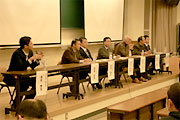 休憩を挟んで座談会「生態系ネットワーク形成に向けて」が、本学健康科学部の福田秀志教授を座長に進められました。知多半島で環境保全に取り組む団体が、それぞれの取り組みを報告した上で、参加者からの質問にも答えながら意見交換を行いました。参加者にも保全活動に携わる方が多く、活動の継続・発展性の課題や、外来種も含め環境に手を加える方法や度合いなどに関する活発な質疑応答がありました。
