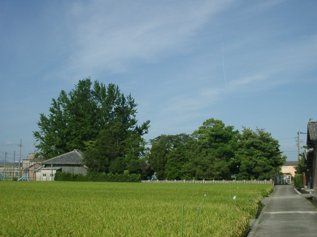 スクミの成体は手前の田んぼにいました。後方左の巨木は国天然記念物「乳保神社のイチョウ」です