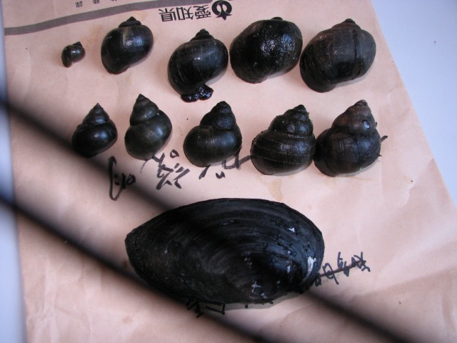 【右】上段→スクミ 中段→タニシ 下段(1ヶ)→ドブガイ
