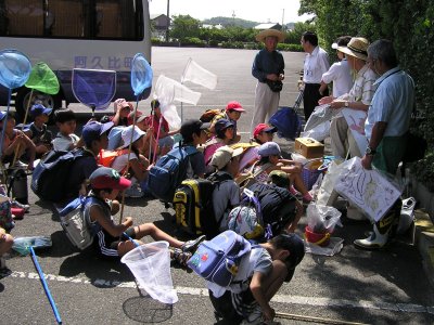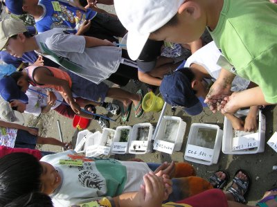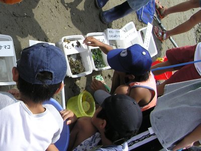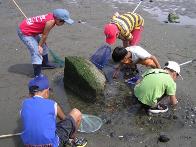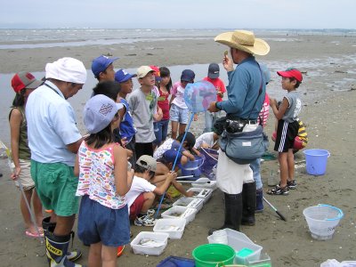 阿久比町中公民館は、毎年夏休み中に小学生を対象に自然体験・物づくり体験をすることにより、自然を大切にすることや物を大切にすることを学んでいます。「干潟の生き物を観察しよう」はその行事の一コマです。
