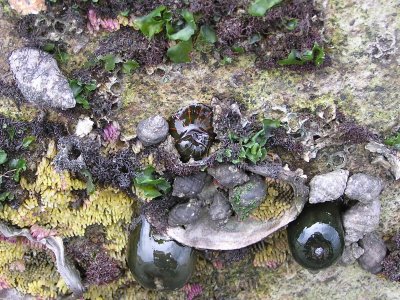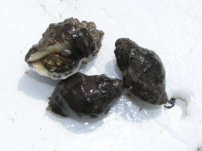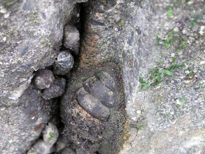 【右】防潮堤の割れ目にイボニシとヒザラガイが付いていました。
