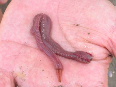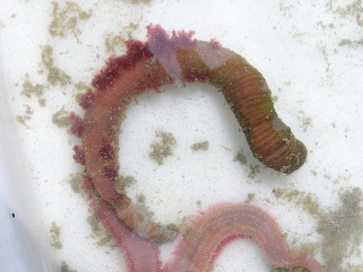 【左】干潟にに住むタマシキゴカイです。体に付いたブヨブヨの赤いものは鰓です。