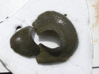 【左】砂茶碗(すなじゃわん)といわれているツメタガイの卵塊です。