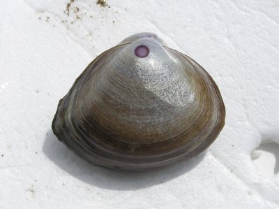 【左】シオフキがツメタガイに食べられ掛けた穴です。シオフキは貝を溶かす液を出し歯舌(しぜつ)で削って穴を開けます。