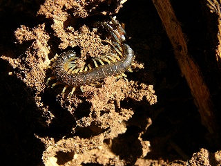 【左】アオズムカデは、中々獰猛でミミズなど小動物を食べます。噛まれると毒がありますので注意してください。