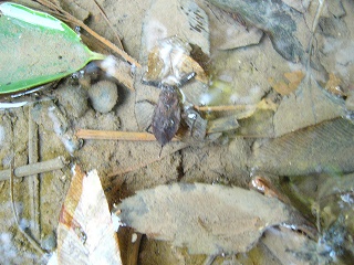 【右】ヒメタイコウチで、水中より湿った土手の枯れ草や枯れ葉の下で見かけます。今回は浅い水の中にいました。