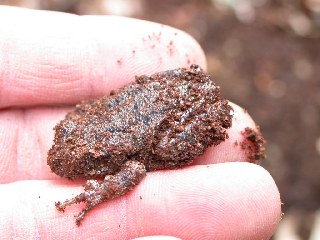 【左】アマガエルが冬眠していました。 【右】落ち葉を分解してくれるケバエの幼虫。