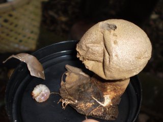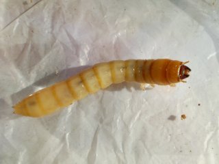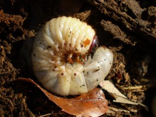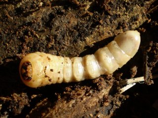 【左】朽木の中から大きな幼虫が出てきました。  【右】カブトムシの幼虫。