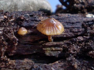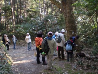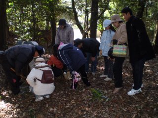 今朝も氷点下の冷え込みで寒い日です。観察路を説明後、潜ると「おこり」に罹るとされている箭比神社の鳥居を左に巻いて本殿に向かいました。途上、斜面に茶褐色の緻密で硬い岩石・チャート(地質:加木屋層)が露出、早速、火打石よろしく火花を散らし石器時代のロマンに浸りました。カラ類の野鳥が木の実を啄ばむ中、大きく立派なカブトムシの幼虫を、参加した子供さんが見付け歓声が上りその後次々と朽木の虫さんを発見しました。朽木の虫を観察すると食べる順序があるようです。比較的堅いt樹木をカミキリの幼虫が食べ、少し柔かくなった木をクワガタが、更にぼろぼろになった樹をカブトが食べているみたいです。また、針葉樹を好む虫と広葉樹を好む虫の種類が違うみたいです。単に虫を採集するのではなく私達の身の回りの自然環境についても意識したいと思います。境内で収集した虫さん達の分かち合いを解説を交えて行った後、解散しました(小川/記)。
