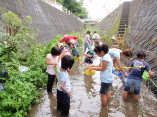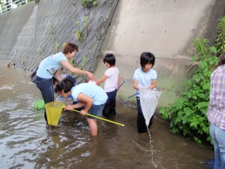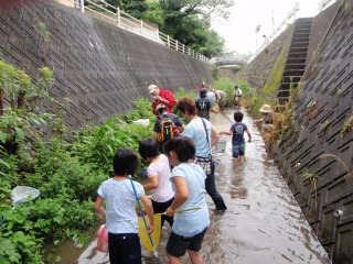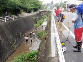 タモ(網)を使って効果的に生きものをゲットするための“やり方”説明の後、車の交通量の多い道路を横切って、川に入ります。今日は水が比較的に多く、普通の長靴では川に入ったとたんに水が入ってきます。そんなことには構わず、子どもたちは時間一杯、繰り返し挑戦していました。
