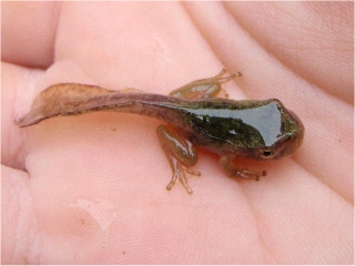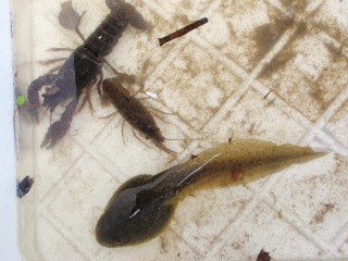 【左】アメリカザリガニ、オタマジャクシ 【中】手足の出たオタマジャクシ  【右】カワニナ