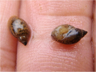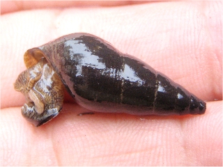 【左】サカマキガイ  【中】終了の合図が出ました  【右】地上で、ゲットしたものをバットに入れています。このとき、子どもたちの眼は光ります。