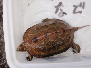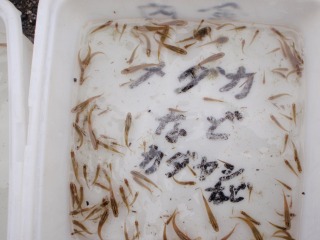 フナ、カマツカ、オイカワ、マドジョウ、ホトケドジョウ、モツゴ、ヨシノボリ、タモロコ、メダカ、カダヤシ、コオイムシ、カワニナ、シジミ、タニシ、ヒメガムシ、ヒメモノアラガイ、ヤゴ、マツモムシ、ハイイロゲンゴロウ、アメリカザリガニ、イシガメ、オタマジャクシ(ウシガエル、ダルマガエル、ヌマガエル)などもゲットしました。