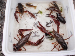 【左】指導員がゲットした特大アメリカザリガニ  【右】ゲットしたものを一種類ずつ説明