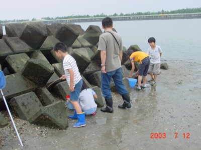 【左】コンクリートの波よけで生き物を探しています。コンクリ−トは磯と同じで、岩浜に生活するカニさんが隠れていたりフジツボ、カキ、イソギンチャクが着生したりしています。