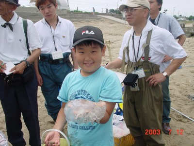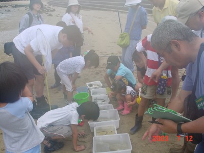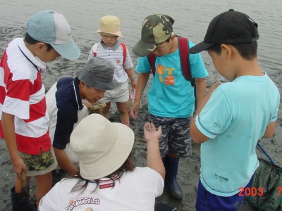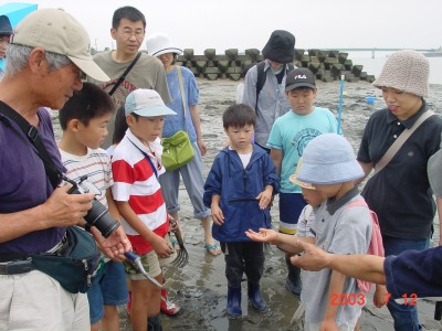 知多市地域文化センターの主催で行われました。蒸し暑い日で、時々小雨が降る天気でしたが、たくさんの家族が参加してくれました。子供たちはカニさんが大好きで、同じ種類のカニを次々に採集してバケツの底が見えないほど集めた子もいました。