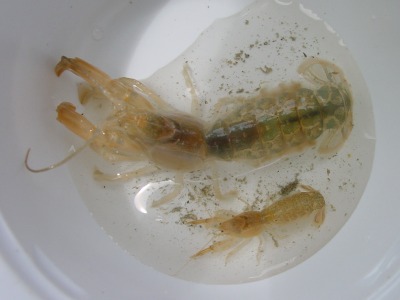 【右】藤前干潟の主役のアナジャコでこの海岸でもたくさん見られます。ハサミが退化していて竪穴を掘って生活し、潮が満ちると浮遊プランクトンなどをたべています。