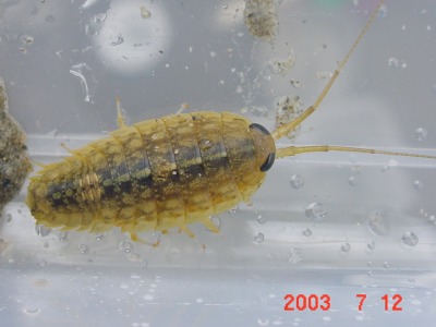 【右】フナムシは漂着した動物の死体を食べる海の掃除屋さんです。昆虫類ではなく、ワラジムシやダンゴムシと同じ等脚類の仲間です。