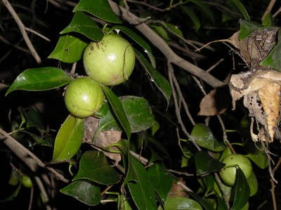 【左】梅みたいな実がついていました。何でしょう。ツバキの実です。