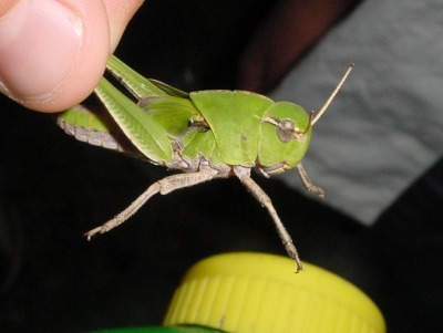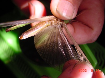 【左】トノサマかクルマかを判定するために羽根を広げてみました。トノサマバッタです。