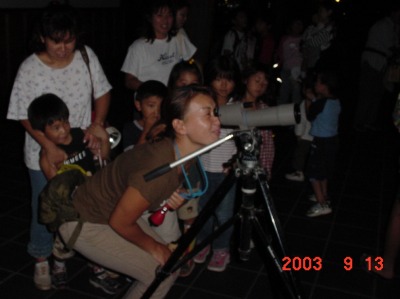 【左】最後に火星と月をフイルドスコープで見ました。火星と月をはじめてみた人がほとんどで、特に月のクレータを見て大感激をしていました。