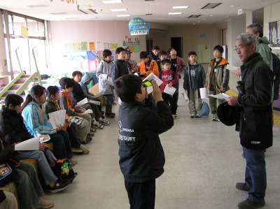 【左】知多市地域文化センターのロビーで野鳥の生活について、出発前に事前説明を聞いています