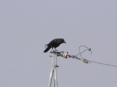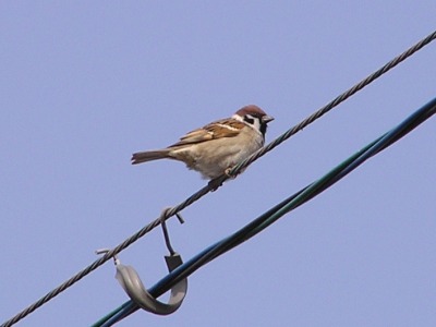 【右】スズメが電線に止って、私たちを見下ろしていました。