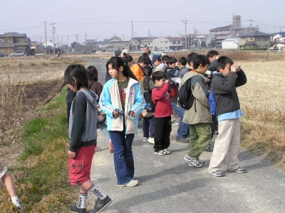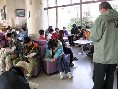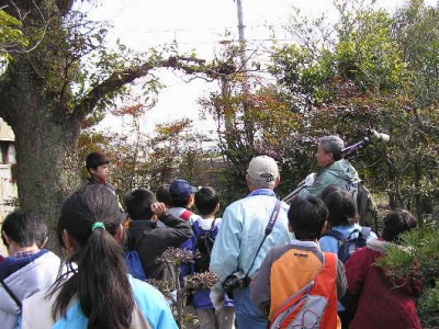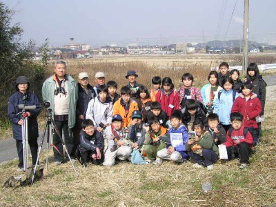 この時期は未だ寒さがきつい時でが、春を思わせる暖かい日になりました。この日は、野外で野鳥を観察するのによい条件でした。今回、参加したのは小学生ばかりで、地域文化センターが募集して一年間シリーズで、自然体験をしてきたメンバーです。まず、地域文化センターの玄関ホールで野鳥について解説をしました。野鳥に興味の無い子もいましたが、静かに聞く事ができました。野外に出て観察を始めたが、双眼鏡の扱いになれていない子が多かったので、まず双眼鏡の操作を伝授しました。子供たちに、持参物として、双眼鏡と野鳥図鑑の指示がされていたみたいです。ほとんどの子は図鑑を大事にリックに入れたままでしたので、取り出すよう指示をしました。フイルドスコープで見た鳥の名前を教えて、図鑑調べるよう指示をしましたが調べ方が分からない子がたくさんいました。そこで索引を利用して調べる方法の実習をしました。やがて子供たちはフイルドスコープ覗いて「図鑑そっくりの鳥がいた」と感激をしていました。図鑑が先か鳥が先か。卵が先か鳥が先か。まあ、どちらでもいいです。
