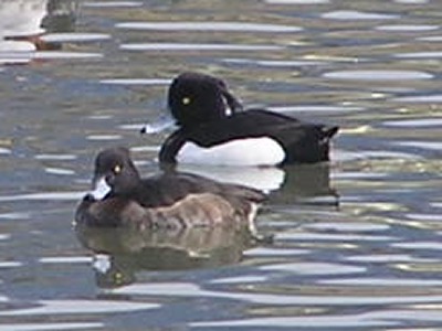 【右】手前がキンクロハジロのメス、遠い方がオスです。これも潜水するウミガモです。冠羽が伸びているのが特徴です。