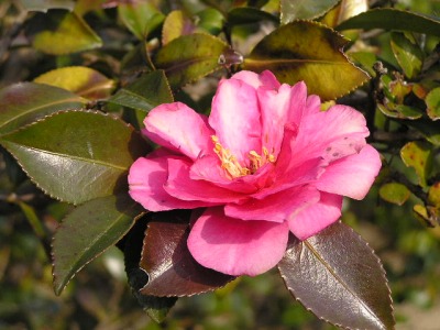 【左】サザンカです。メジロがよく蜜を吸いに来ます。