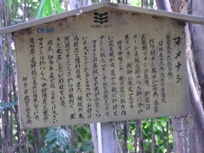 【右】小鳥が食べる実をつける樹木について説明しています。大きな木はクスノキ。垣根はナンテンです。どちらも小鳥が好きな実をつけます。