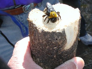 【左】穴に中に何かいるみたいです。   【右】クマバチだ出てきました。やささしいハチですがつかむと刺されます。