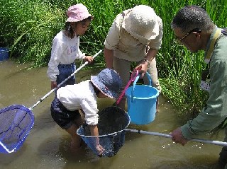天気がよく、気温もぐんぐん上がり、水の中に入って生き物を探す条件に絶好の日となりました。梅の館に集合し挨拶の後、、川の中の生き物の採集方法を参加した子供も加わり、寸劇を使って実演をしました。ユーモアたっぷりの熱演は、中々好評で参加者の皆さんとリーダーとが和気藹々(わきあいあい)とした雰囲気を作ることができました。諸注意の後、少し離れた信濃川新阿原橋の近くにある駐車場に移動しました。川へは直接降りることができないのではしごを使い1人ずつ慎重に川に降りました。川岸にマコモ、クサヨシ、ホソムギなどが生え、ちょうど良い魚の隠れ場所となっていました。また、田植え時で水量も結構有り、川の生き物にとっては比較的住みやすい環境になっていました。(降幡・記)