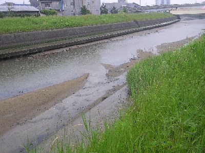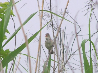 【左】オオヨシキリが休耕田のヨシでさえずっていました。口の中が赤いのが目立ちます。   【右】矢田川の河口に近いところです。ヨシとシオクグが茂り、生き物が住みやすくなっています。