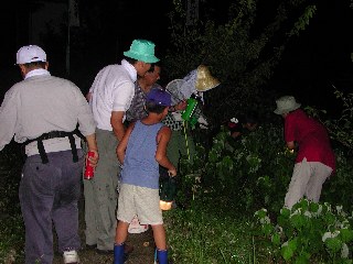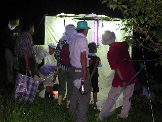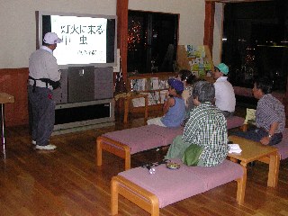 夕立後の灯下採集には良い条件である。観察前に平松さんが今夜見られそうな虫等の 事前説明後、観察会に入る。