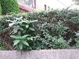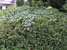 【左】ヤブガラシがつつじの上を覆っています。林縁に生え樹木に巻きついて広がります。