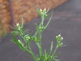 【中】ヒメムカシヨモギです。明治維新のころ渡来し、鉄道線路に沿って広がったので明治草、鉄道草などと呼ばれました。