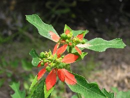 【右】野生化したショウジョウソウ(猩々草)トウダイグサ科です。クリスマスに飾るポインセチアはショウジョウボク(猩々木)で同じ仲間です。