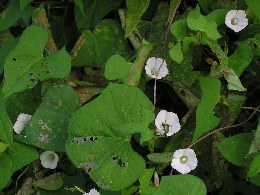 【右】花が小さいマメアサガオです。北アメリカ原産で戦後、輸入穀物に混ざって来たと言われます。