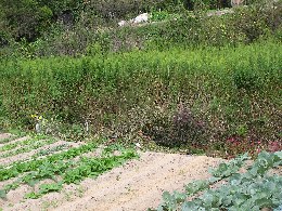 【右】きれいに雑草が除かれ、野菜が植えられています。畑の向こうは放置されたためセイタカアワダチソウがはびこっています。