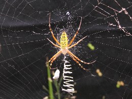 【左】ナガコガネグモが巣をゆすって威嚇していました。たくさん害虫を食べてくれます。