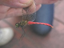【右】マユタテアカネ。平地や丘陵地の、木陰があるような池、湿地で発生するしうです。