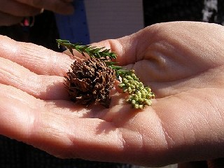 【中】たくさん花粉が出て、アレルギーを起こすスギの雄花と昨年の球果です。