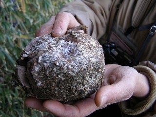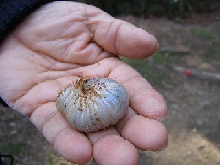 【右】竹やぶでオニフスベを見つけました。オニフスベは人間の頭くらいの大きさになる白いキノコで若い内は食用になります。
