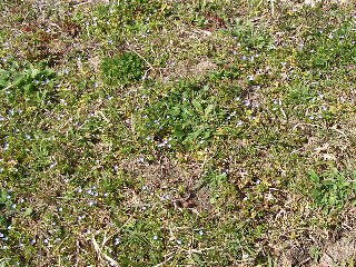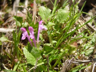 【右】花はシソ科のホトケノザです。ダイコンみたいな葉はホトケノザ(コオニタビラコ)です。