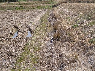 【左】水田の土手下に溝が切ってありました。地下水が出るところは水温は低くなるのでイネの成長を妨げるための防止です。
