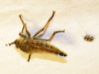 【中】ぼけた写真のシオヤアブ。コガネムシなど甲虫をえさにしている。