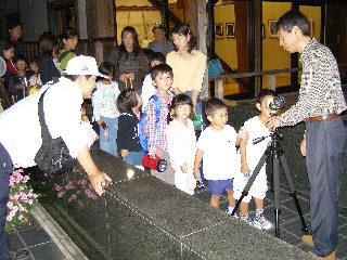観察に出かける前に明かりに集まる虫を狙って水銀灯を点灯させました。梅の館で参加者にお月さんのお話と夜観察する虫さんのお話をして出発しました。月が西に随分傾き始めていたので森に出かける前に月の観察をしました。月は月齢8日で上弦の月、月の凸凹を観察するのに良い日でした。子供たちは交代で感激しながら望遠鏡をのぞきました。丁度、頭の上で夏の大三角形も観察できました。