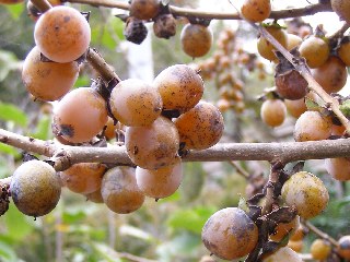 知多四国八十八ケ所のお寺が五寺も一ヶ所に集った厳粛・静寂な趣きの中に昔ながらの田園風景が残っていて心落ち着くところです。密厳寺の裏山には「ヤマモモ」「アベマキ」「アラカシ」などの大きな木が残り「アズキナシ」が可愛い赤い実をつけ、お寺の境内には「シナノガキ」(別名マメガキ)、「マユミ」が小さな実をつけ晩秋の季節を感じさせました。周辺には樹木の育成に邪魔をする竹が生い茂り、その竹を何かに利用できたらと話し合いました。時間が短く感じるような観察会でした(蔦谷/記)。