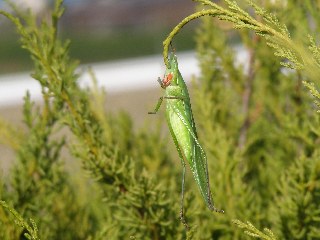 【左】クビキリギスがイブキに釣り下がっていました。